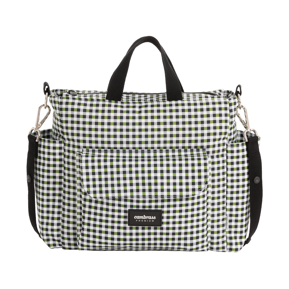 El Bolso Maternal Pack de Cambrass de gran amplitud con capacidad para guardar todo lo que necesitas para tu bebe. Su sistema de asas cortas lo hace útil tanto como bolso de mano o maletín así como de bandolera o incluso para el carro, ya que el asa larga dispone de clips para poder colgar del cochecito. Tanto el tejido exterior como el interior (resinado) con el que está confeccionado el bolso cuentan con un acabado impermeable que sumado a su base rígida aporta estabilidad evitando que pierda su forma tanto lleno como vacío e incluso después del lavado. Este bolso cuenta con prácticos bolsillos interiores y exteriores para una perfecta organización de los accesorios. El cierre del bolso es con cremallera YKK de larga duración.