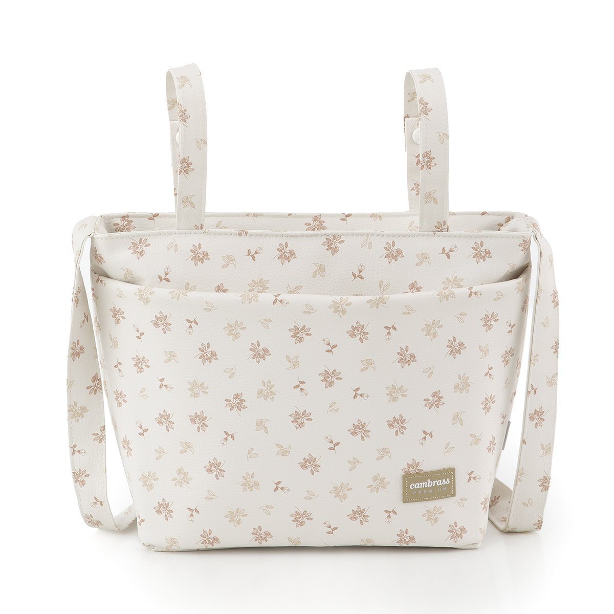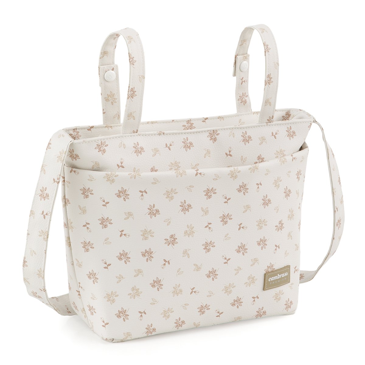 Un bolso organizador con asas cortas para colgar del carrito, con diseño de bolsillos internos y externos, ofrece fácil acceso y orden para los accesorios del bebé durante los paseos. Práctico y accesible.