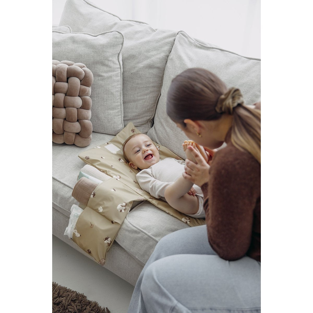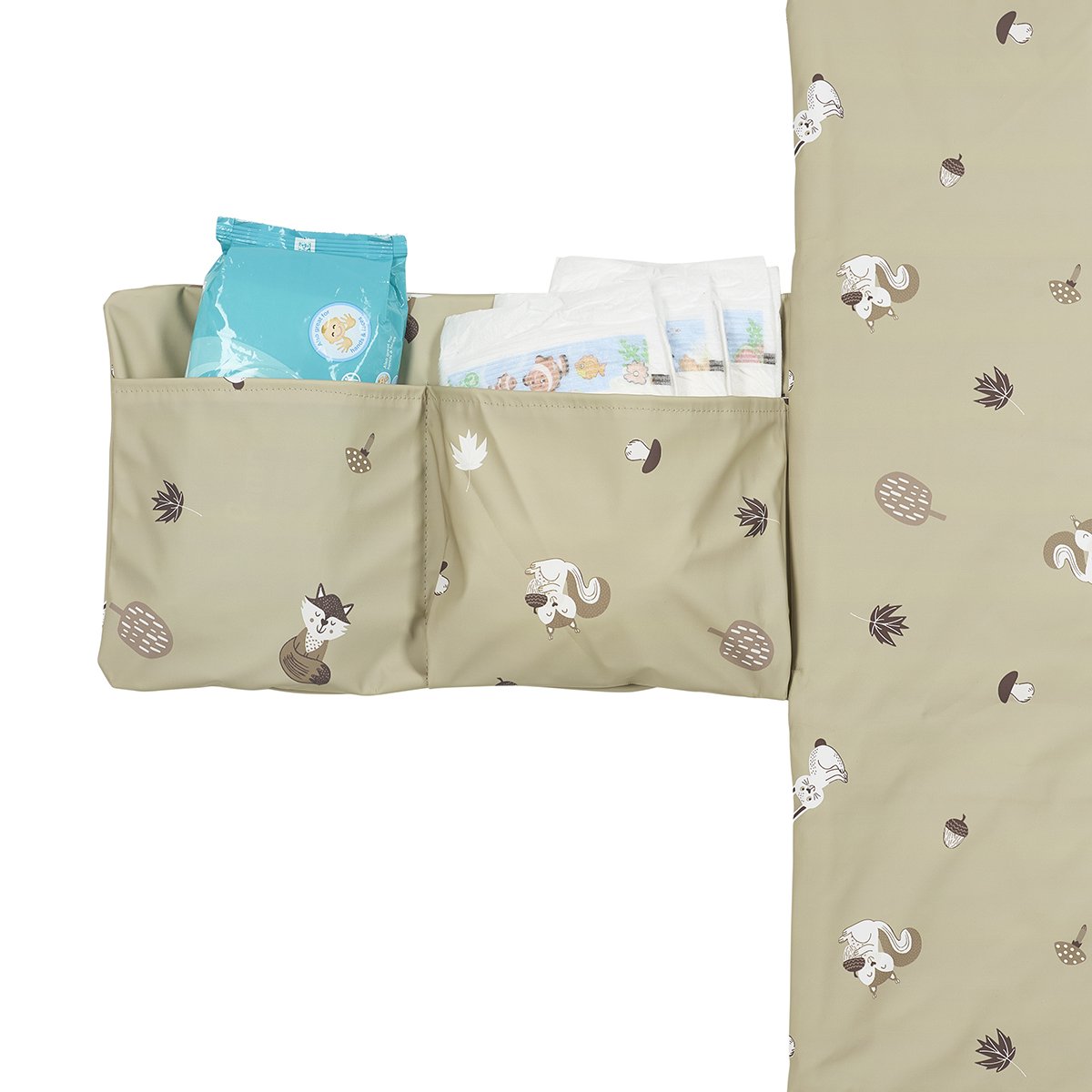 El cambiador tiene un precioso estampado suave de hojas de ginkgo, para que tú y tu pequeño aventurero salgáis siempre con estilo.