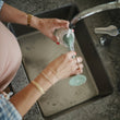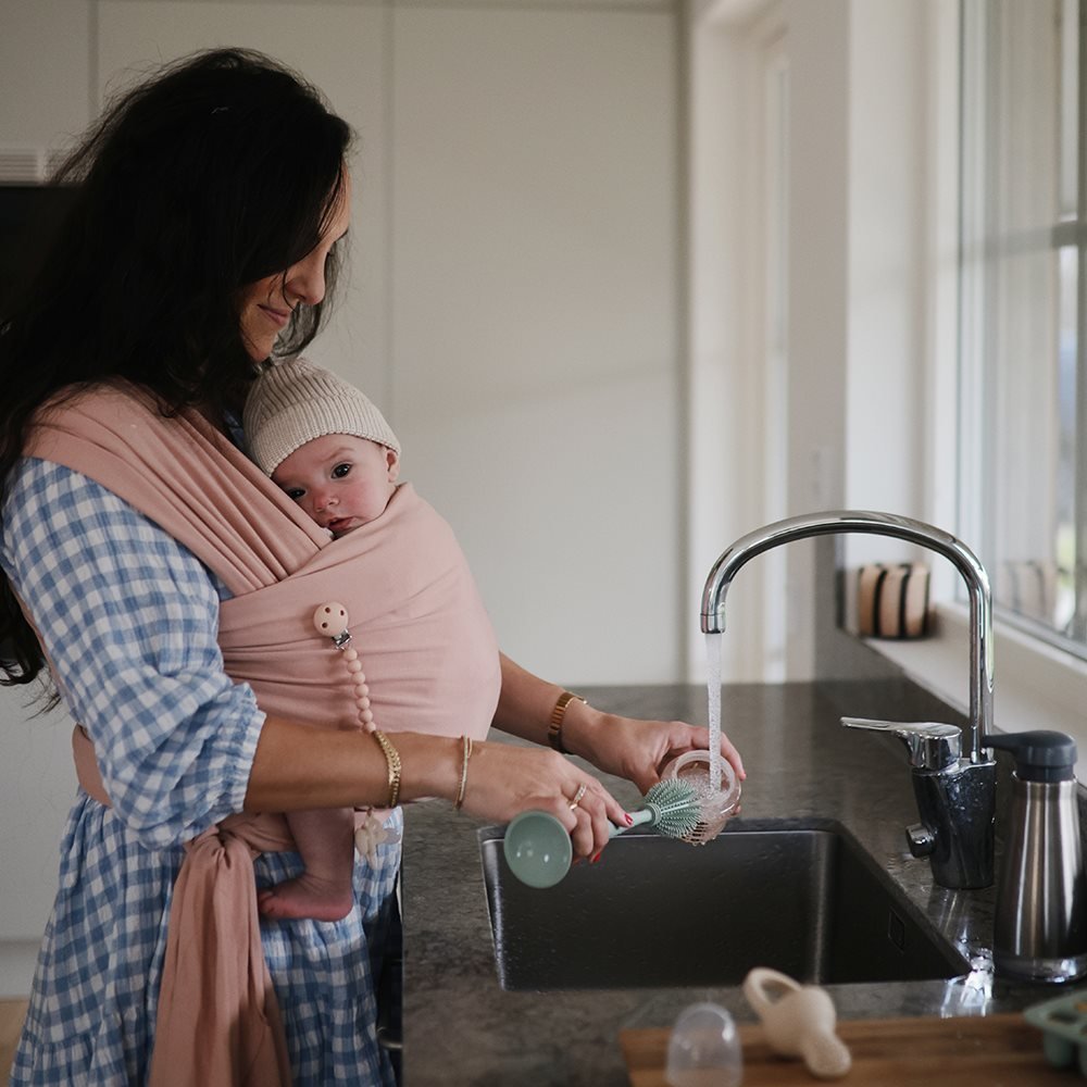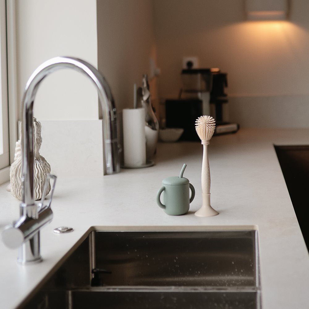 En el otro lado, el cabezal más pequeño es perfecto para limpiar con precisión las tetinas de los biberones y los espacios reducidos. El extremo más pequeño se guarda cómodamente dentro de la base de succión, minimizando el desorden en la cocina y manteniendo la escobilla fácilmente accesible. El mango ergonómico con textura garantiza un agarre cómodo, lo que permite a los padres lograr una limpieza a fondo con facilidad.