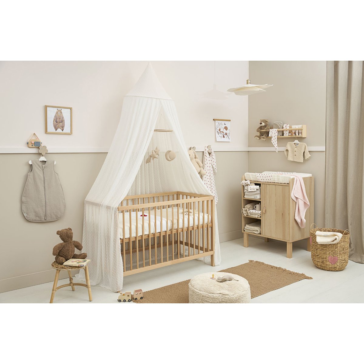 Esta preciosa mosquitera Plume aporta un ambiente elegante y clásico al dormitorio de su hijo. Con sus sutiles lunares bordados, la mosquitera crea un ambiente elegante sobre la cama. La mosquitera no sólo es bonita, sino que también ofrece una sensación de seguridad adicional a su hijo. La mosquitera no sólo queda genial con una cuna o una cuna, sino que también una cama infantil, una cama juvenil o una cama individual adquieren una belleza encantadora de una sola vez gracias a esta mosquitera. La mosquitera se suministra sin mástil de pico.