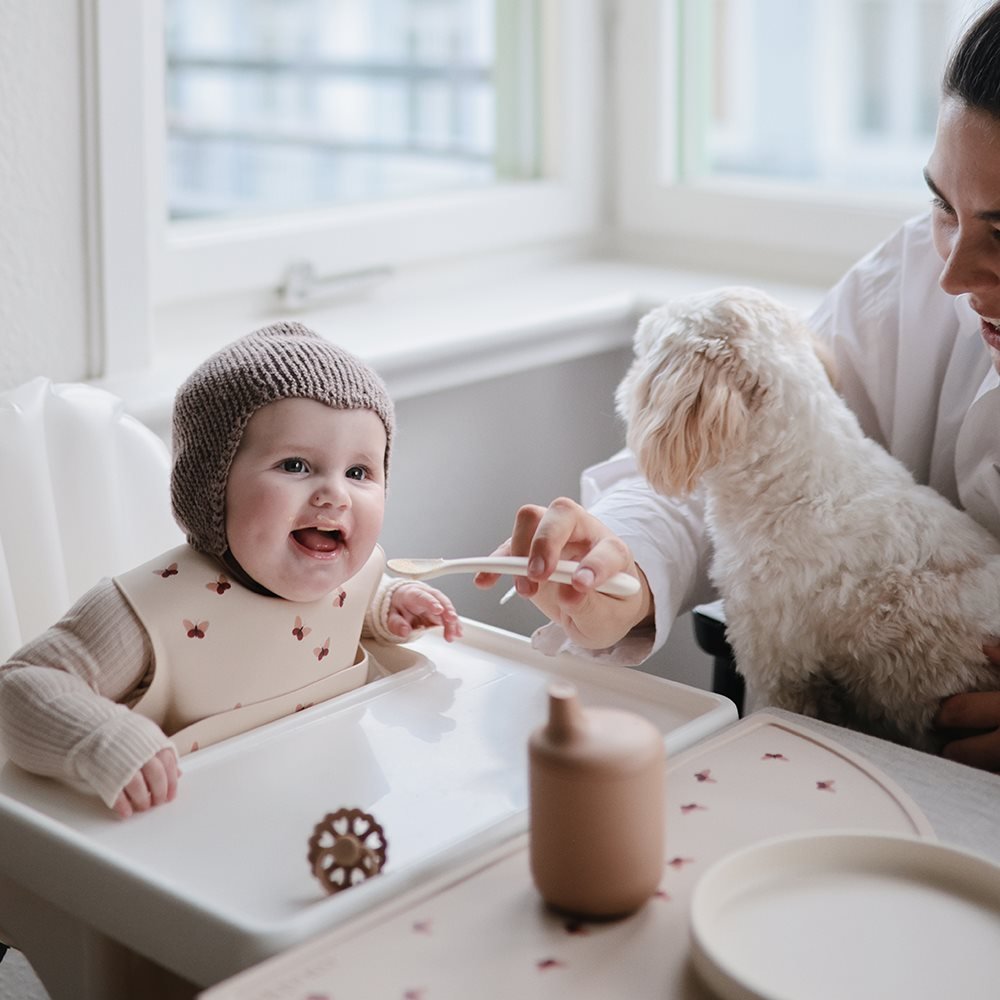 ¡Use un mantel individual de silicona de Mushie para facilitar la limpieza!