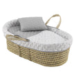 El moisés de palma acolchado de Cambrass, está indicado para los primeros meses de vida del bebé y gracias a sus asas su transporte es muy sencillo. Consta de una base de mimbre, colchón, colcha, cojín y vestidura, que puede coordinarse con la decoración de la habitación. Además cuenta con todos los certificados que garantizan la seguridad del bebé velando por su salud ya que el mimbre del moisés está tratado para la eliminación de pequeñas larvas de psocópteros que en determinadas ocasiones se encuentran en las hojas de palma utilizadas en la fabricación de los moisés. Este capazo es adecuado para niños que no pueden sentarse por si solos, girarse y que no pueden empujarse a si mismos con sus manos y rodillas. Máximo peso del niño: 9kg. Si el moisés está destinado a ser usado con un soporte, comprobar que las dimensiones de éste último se corresponden con aquellas de la base del moisés Medidas de la base del moisés: 390x800 mm. Fabricado en España. Por Cambrass