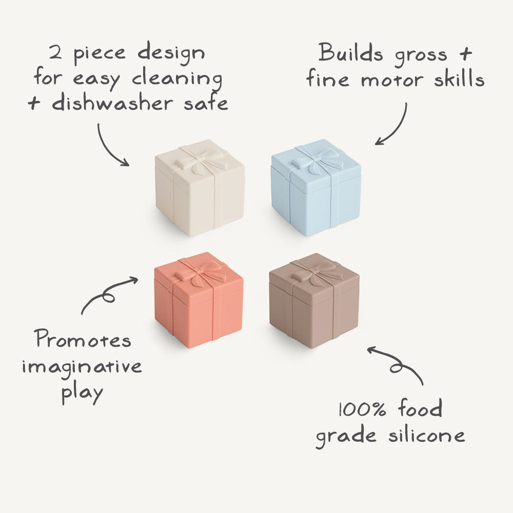 Cada colorida cajita de silicona cuenta con una tapa desmontable que permite a los peques combinar y mezclar las tapas para crear sus propios regalitos únicos. Diseñado para adaptarse perfectamente a sus manitas, este set fomenta la creatividad al mismo tiempo que ayuda a desarrollar la motricidad fina y el reconocimiento de colores.