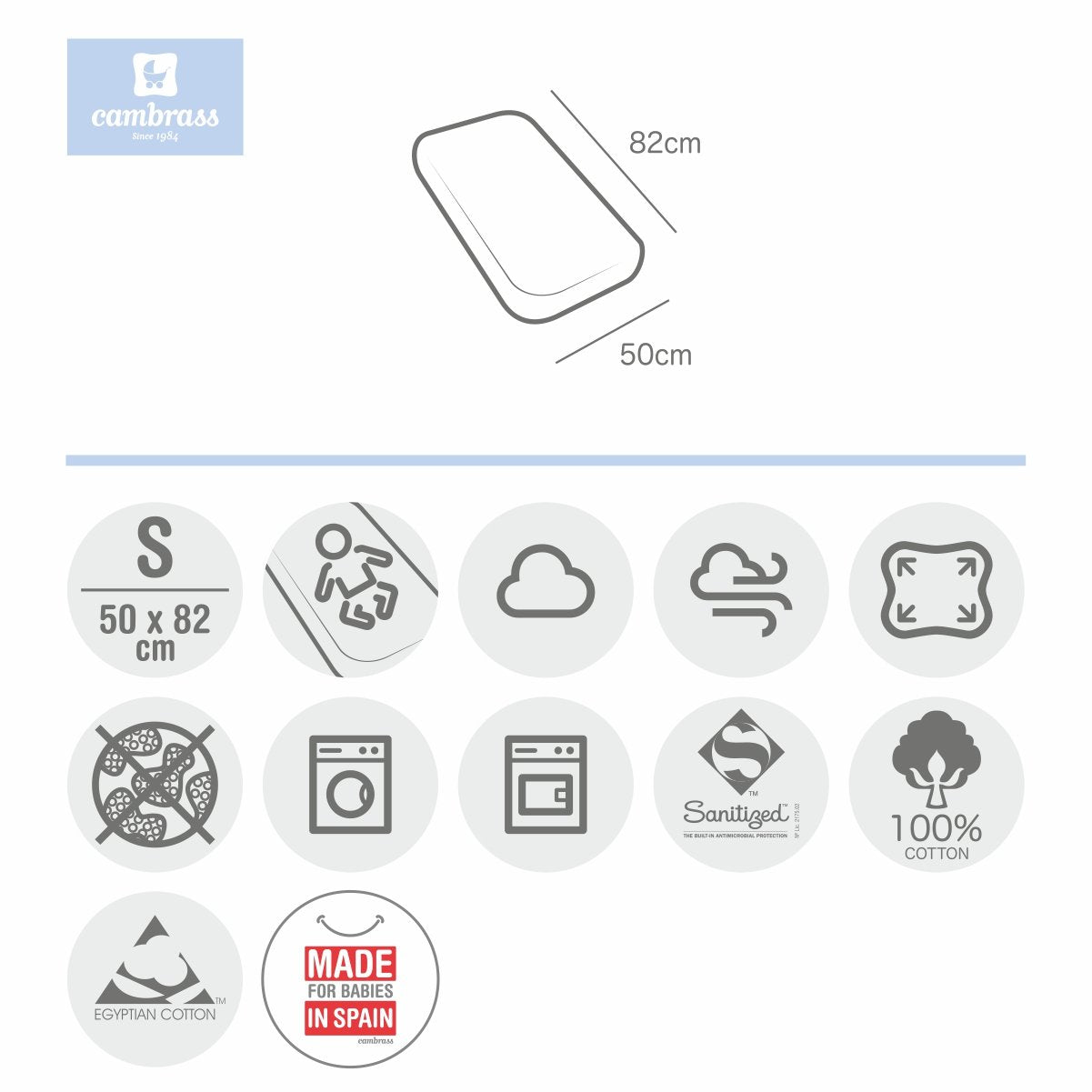 La sábana ajustable para minicuna de Cambrass funciona como una práctica bajera al adaptarse al colchón por los laterales con su goma elástica. Su fabricación con algodón egipcio 100% y el tratamiento Sanitized garantiza su higiene ya que ofrece una protección antimicrobiana duradera que evita el desarrollo de bacterias y hongos así como los malos olores.