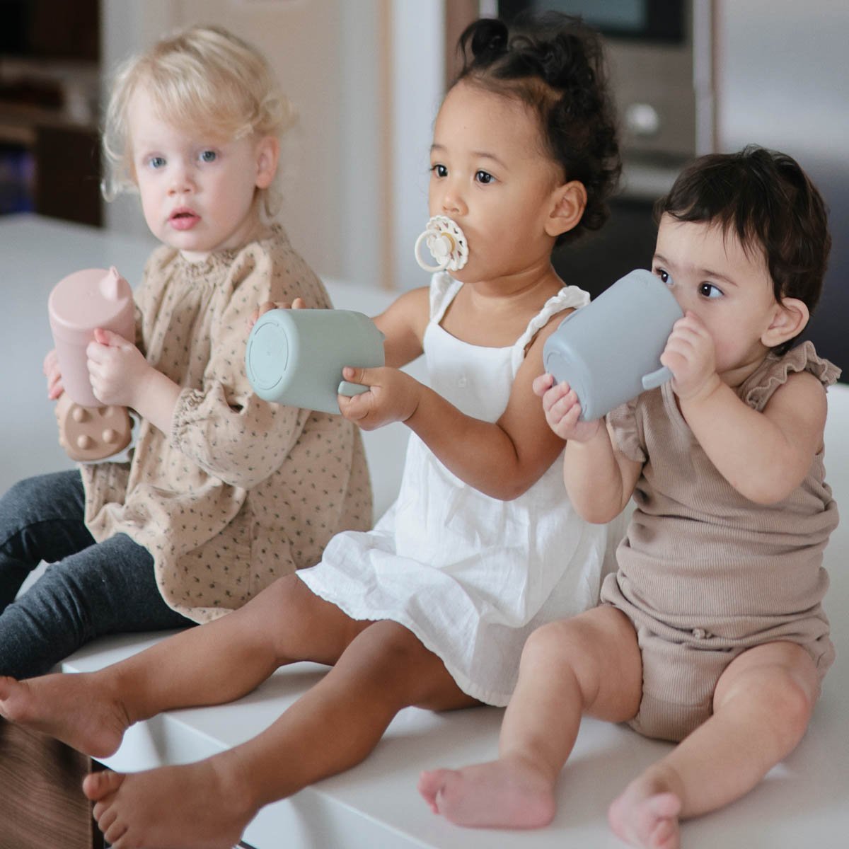 Estas elegantes tazas en varios colores suaves son fáciles de sujetar para tu bebé.